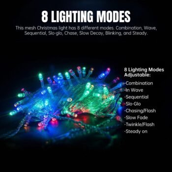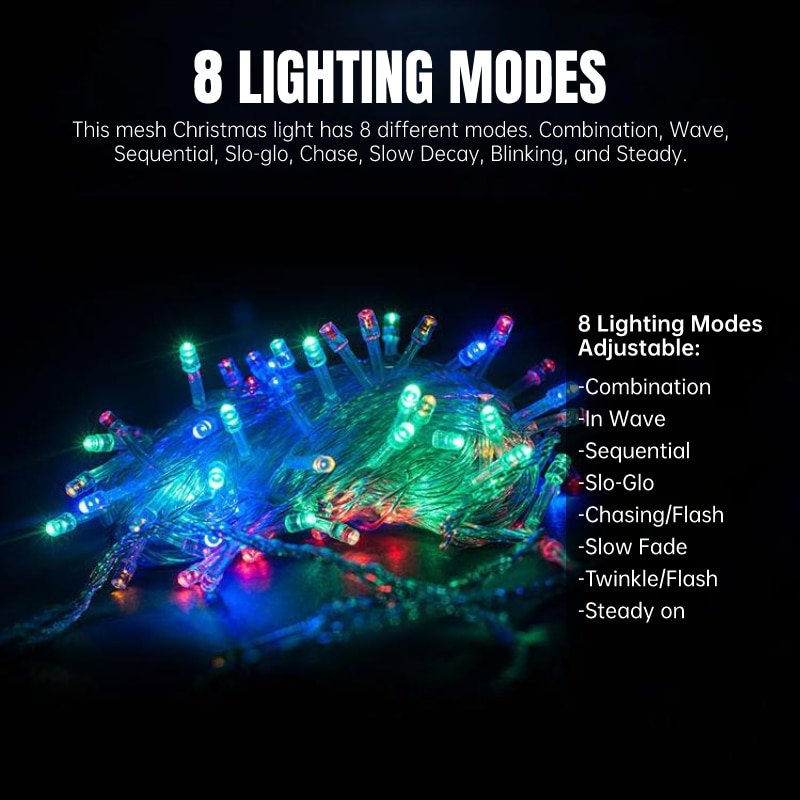 8 Lighting Modes: This mesh Christmas light has 8 different modes. Combination, Wave, Sequential, Slo-glo, Chase, Slow Decay, Blinking, and Steady.
